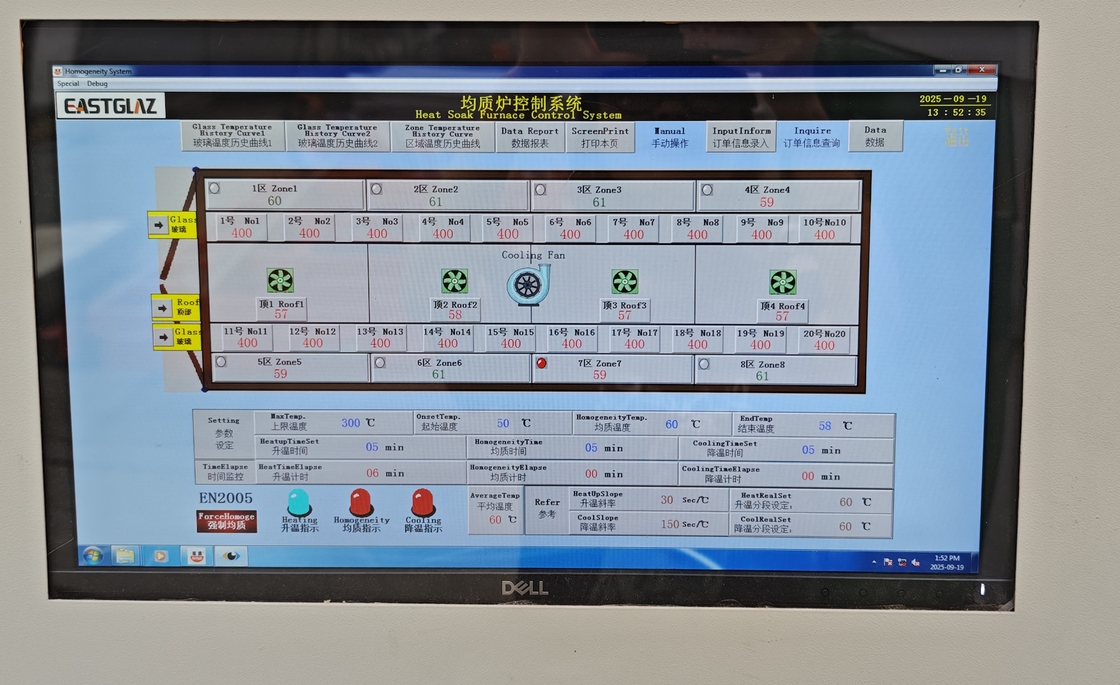 The Heating Soak Test Furnace was designed and manufactured according to European safety performance test standard of toughened glass, energization and electricity stoppage of heater adopt solid state relay; technological parameter and program control use computer memory saving and intelligent control, temperature adjustment mode is automatically accomplished by PLC control system; automatic storage of temperature curve and print test report of every time; there are altogether 3 sets blowers to form forced convection circulation system of hot wind, in addition, fitted with 1 inverter blower used for automatic control of cooling rate of unit which is used for control the cooling system constantly reduce temperature; There are 6 thermocouples on top of the furnace body to monitor the temperature in the furnace. And 20pcs thermocouples used for supervising temperature status of glass surface, 32pcs thermocouples on the computer operation interface display information at right time.
